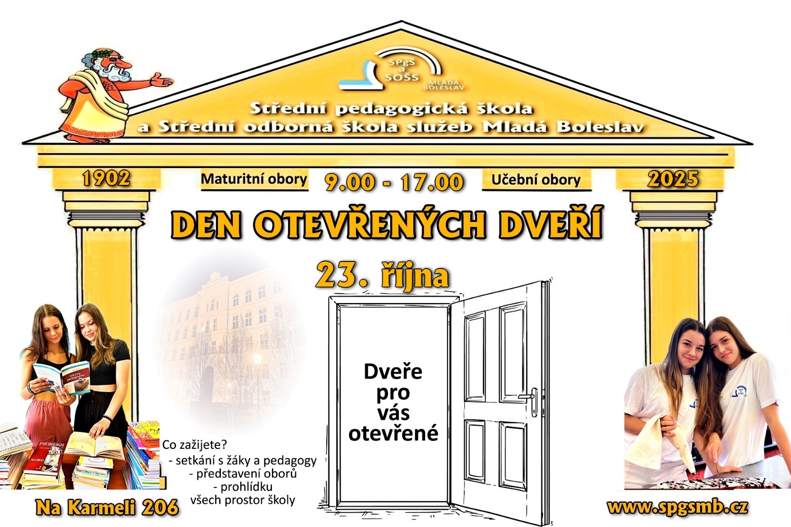 Den otevřených dveří 2024/25 Prosím pozor, termíny k přihlášení na přijímací zkoušky nanečisto máme již plně obsazené! Dny otevřených dveří ve školním roce 2024/25: 24.